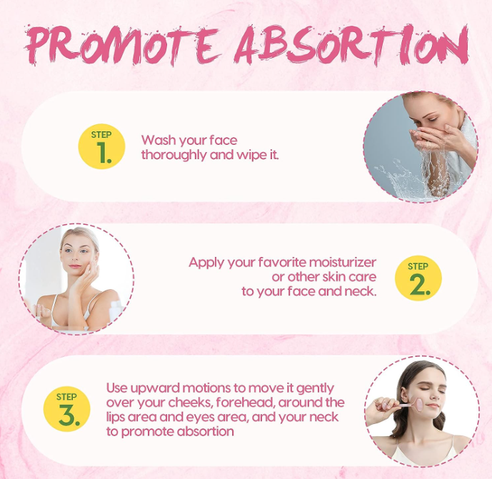 GUA SHA: Scraping and wiping the relevant parts of the skin to dredge the meridians, promote blood circulation, reduce facial edema, shrink facial pores, remove the oil and dirt attached to the pores.
